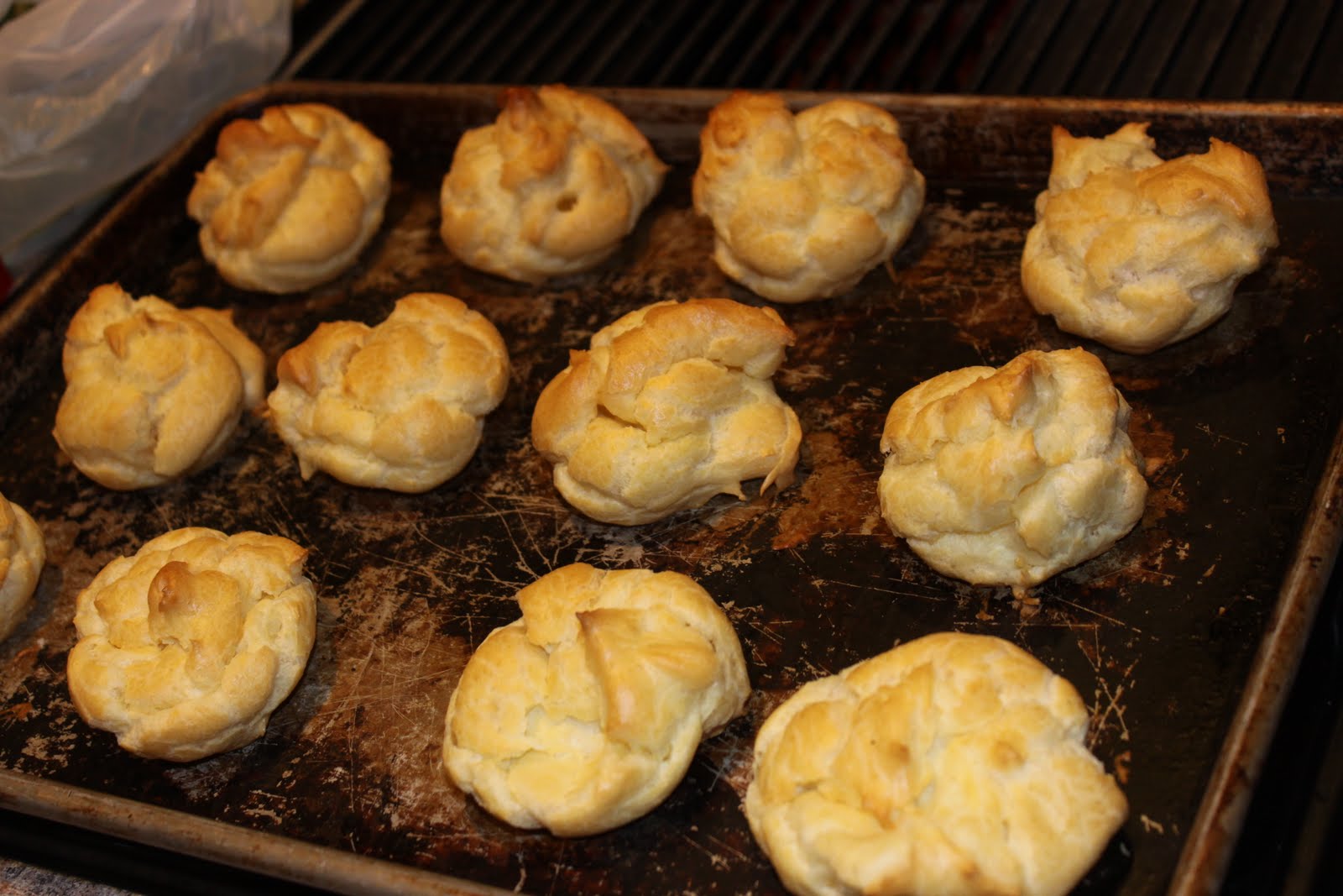 5. When the shells are cool,cut the tops off with sharp knife, pull out spongy middle of puff and set aside,use a pastry bag to pipe the pudding into the shells.